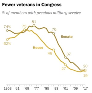 And what about the people who will make decisions to send our men and women into harm’s way? How many of our Senators and Representatives have served? When was the last time we had a combat veteran in the Oval Office? George H.W. Bush was the last serving combat veteran president. He served in WWII as a Naval Aviator receiving the Distinguished Flying Cross. President Bush left office in early 1993. That was 25 years ago.