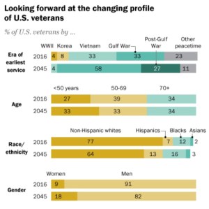 What is the profile of our veterans? And how will it change? Within 30 years all the veterans of WWII and Korea will have passed away as the Gulf Wars veterans become the majority. An increasing percentage of our service men and women will be people of color and women will play a larger role in the armed services.