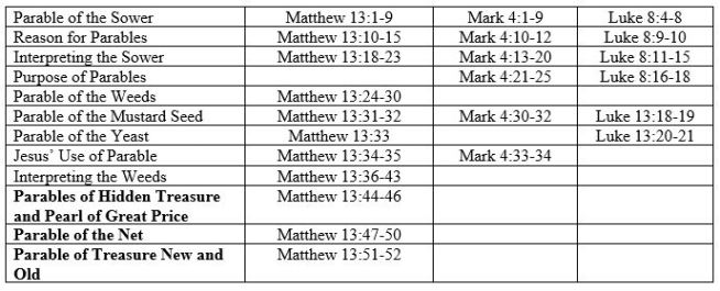 These two parables are unique to Matthew, following immediately upon the parables of the mustard seed and the yeast, and, in some cases, a narrative about Jesus’ use of parables.