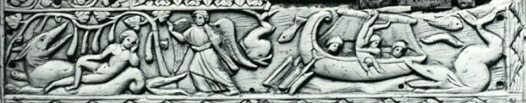 The 4th-century ivory above is typical of the later period. On the right Jonah’s fellow passengers toss him into the sea, where a sea monster comes to swallow him. On the far left the monster has delivered him up to the land. To the right of that, he sleeps under a gourd tree. The next morning, he learns from God the lesson of the gourd. Jonah had complained that after God made him prophesy doom for Nineveh he relented upon seeing their repentance. So, God gives him a shade tree for a day. When the tree dies and Jonah whines about it, God’s reply closes the book: