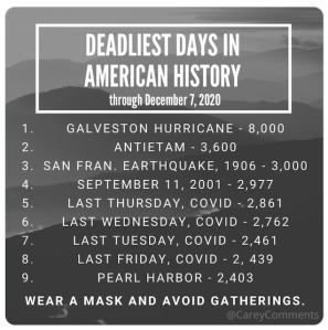 The author, Carey B., commented that her post wasn’t just a spur-of-the-moment idea. She had been thinking about the climbing COVID death numbers as the Dec. 7 anniversary of the Pearl Harbor attack approached. She was reading a novel set in the 1940s, and was struck by how the Americans in the book pulled together and united to win the war. She could not help but notice the stark differences between American society’s reaction to Pearl Harbor, 9/11 and this pandemic.