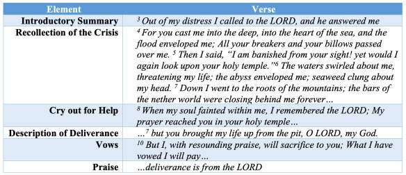 The prayer is looking in the rearview mirror to that point of rescue “Out of my distress I called to the LORD, and he answered me; From the midst of the nether world I cried for help, and you heard my voice.” (v.3) Scholars see Jonah’s prayer as consistent with a psalm of thanksgiving. Kevin Youngblood (Jonah: A Scandalous Mercy, 101) identifies these parts, and they are typical for a thanksgiving psalm.