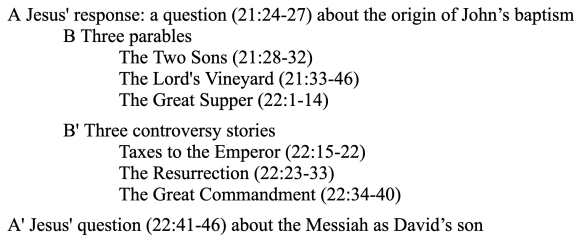 Boring (Matthew, New Interpreters Commentary) suggests this outline for this section that challenges Jesus’ authority. Note that it forms a cascade that begins and ends with a question by Jesus.