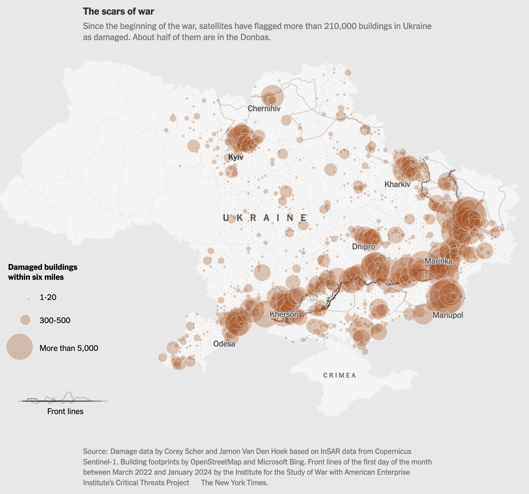 The NY Times released today a report on the damage being done to the nation of Ukraine by the armed conflict. The work was done in cooperation with two leading remote sensing scientists to analyze data from space-based satellites that can detect small changes in the built environment. There are towns, such as Marinka in Eastern Ukraine, where the devastation is as severe, if not more so, than the damage done to Hiroshima by the atomic bombing of that city during World War II.