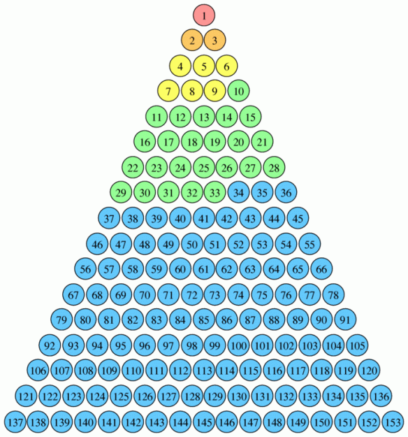 The mention of precisely 153 fish (v. 11) has led to symbolic interpretations of all kinds. And indeed, there must be symbolism involved (unless one assumes that the disciples took time out to make a count). Saint Jerome believed that the zoology of his time taught that there were 153 different kinds of fish; and the number, as a result, reflected universality. Jerome was probably incorrect about the zoologists of his own day, but his idea about universal symbolism was probably correct. Augustine of Hippo argued that the significance lay in the fact that 153 is the sum of the first 17 integers with 17 representing the combination of divine grace (the 7 gifts of the Spirit) and law (the Ten Commandments). Augustine goes farther and notes that “153” is the “triangular number.” He arrives at this conclusion noting that 153=1!+2!+3!+4!+5! (math refresher: factorials). When the factorials are arranged (see diagram), one sees an image of the Trinity. (Sorry: I was a math major undergraduate, and just had to include this…!)