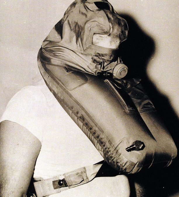 The only known emergency use of the Momsen lung was during the escape from USS Tang on October 25, 1944. The Momsen lung was replaced by the Steinke hood beginning in 1962. This was the device that was standard during my time of service. My only experience with the hood was during SubSchool when all are required to do an ascent from ~100 feet. It was actually kinda’ fun.