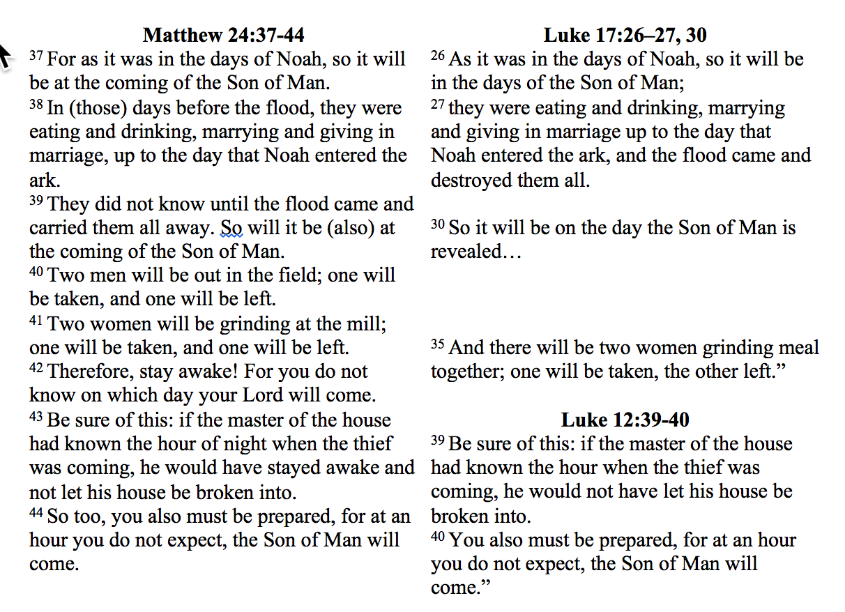 The Matthean text, written well after Paul’s Letter to the Thessalonians, does not contain a “rapture” eschatological understanding. The “taken” (vv.40,41) is, as in Noah, a gathering of the saved community. Those on the Ark did not escape the tribulation, as always, they are witnesses and thus their mission continues. Matthew’s pastoral concerns are the same. The new tribulations of Matthew’s time (and ours) are not something from which to escape, rather the tribulations are a time in which the faithful/saved are revealed – as well as the lost. It is revelatory of what “already is.”