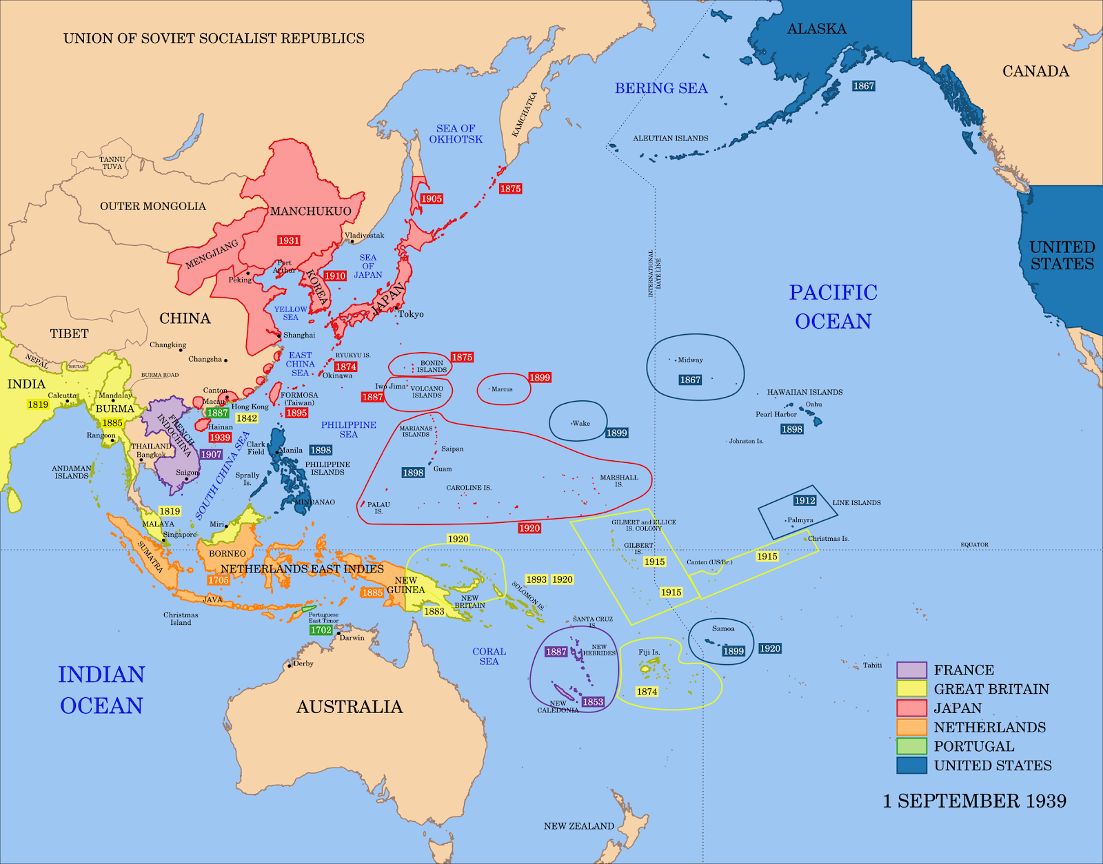 Long before December 1941, dominoes began to fall across the Asia Pacific region. China wasn’t the only nation that had been subjected to Japanese expansion. Japan had annexed Korea in 1910, taken over Manchuria in 1931 (setting up the puppet state of Manchukuo – that no nation recognized), and these are just two of the territories Japanese expansion had acquired by military means. Well prior to 1941, other nations included the Kingdom of Ryukyu (including Okinawa), Taiwan and the Penghu Islands, South Sakhalin, Saipan and Tinian in the Mariana Islands, the Marshall Islands, and the Caroline Islands. The following map shows the Asia Pacific region in September 1939 at the outbreak of war in Europe.